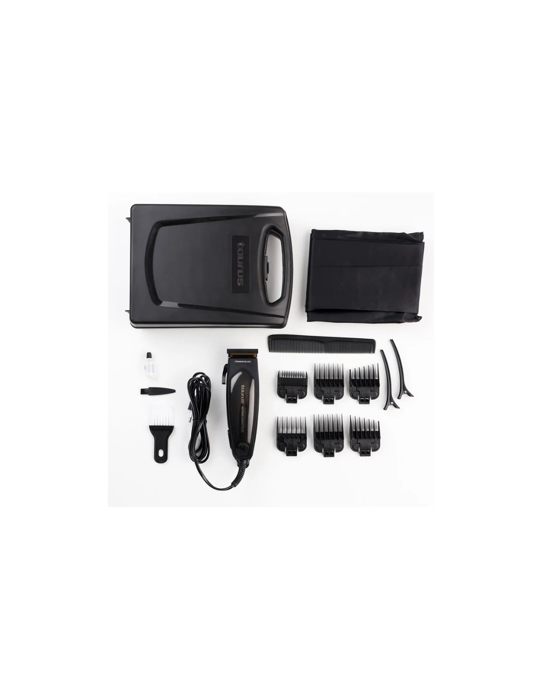 Incluye un set completo de accesorios: un peine, un cepillo grande, una capa de corte, dos pinzas, un cepillo de limpieza, un botellín de aceite lubricante y un protector para tapar las cuchillas cuando termines de usarlo. Todo ello presentado dentro de un cómodo maletín para que puedas almacenarlo todo ordenado y limpio.