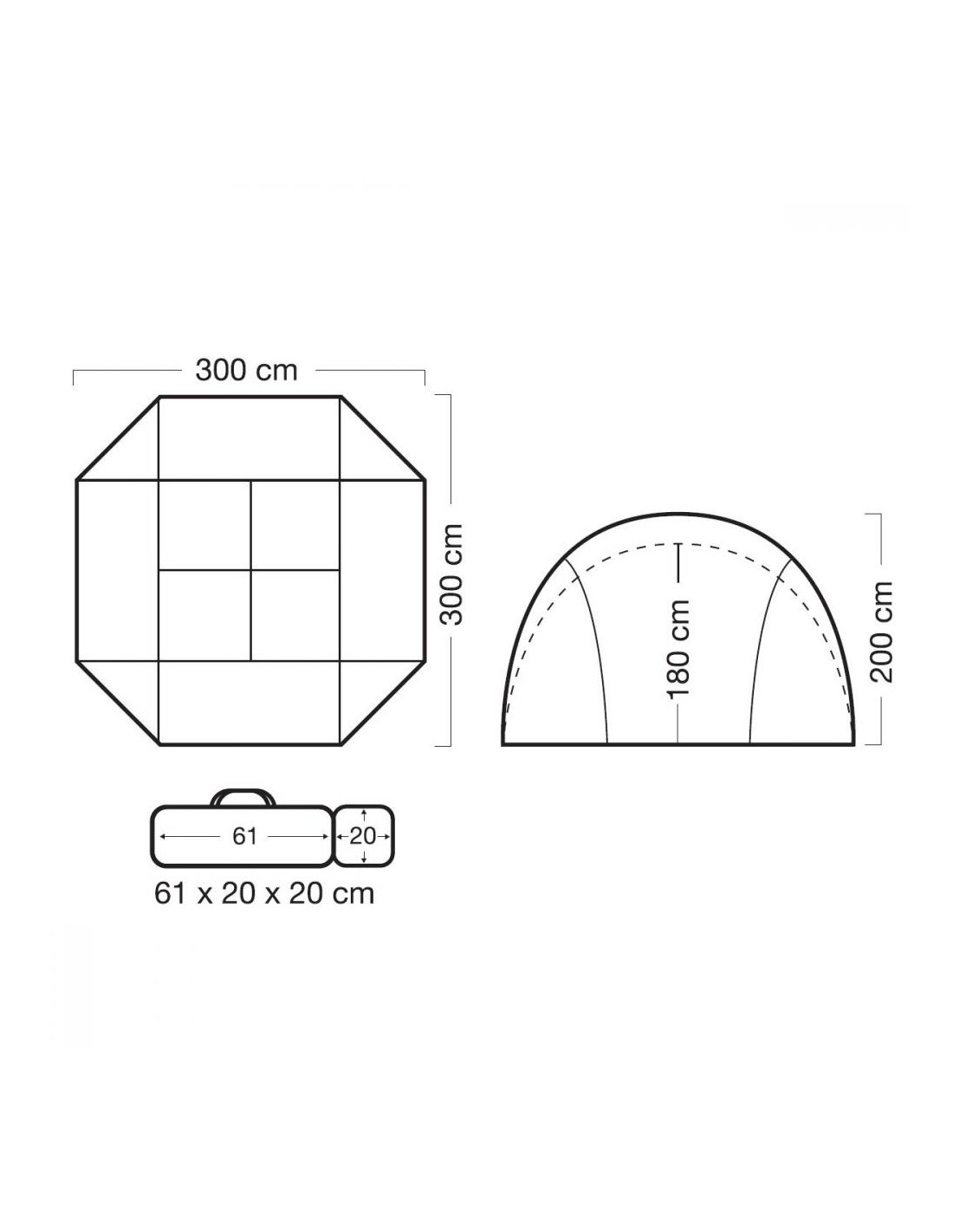 - Las dimensiones de la tienda son 300x300x200/180 cm. y pesa 6,8 kg.