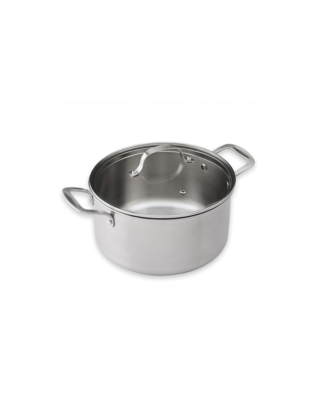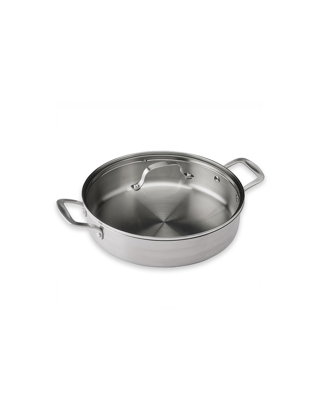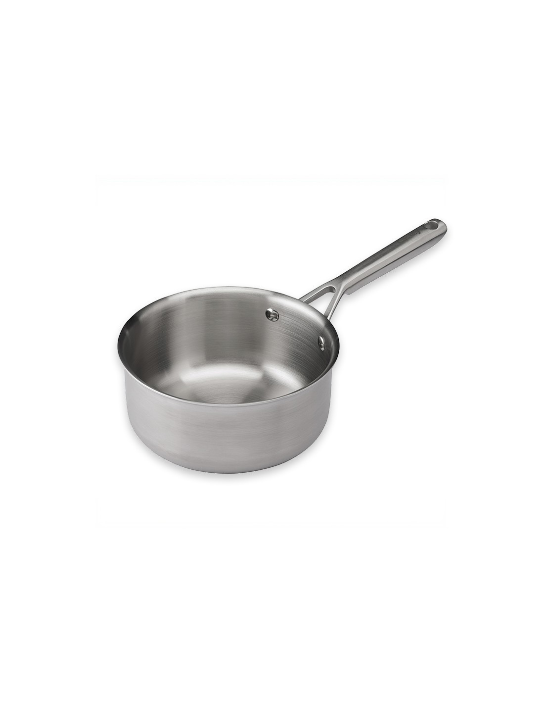 Está fabricada con estructura trimetal (acero inoxidable 18/10 + aluminio + acero inoxidable), que permite una distribución uniforme del calor, ideal para cocciones lentas, guisos, cremas y salsas en cantidades medias.