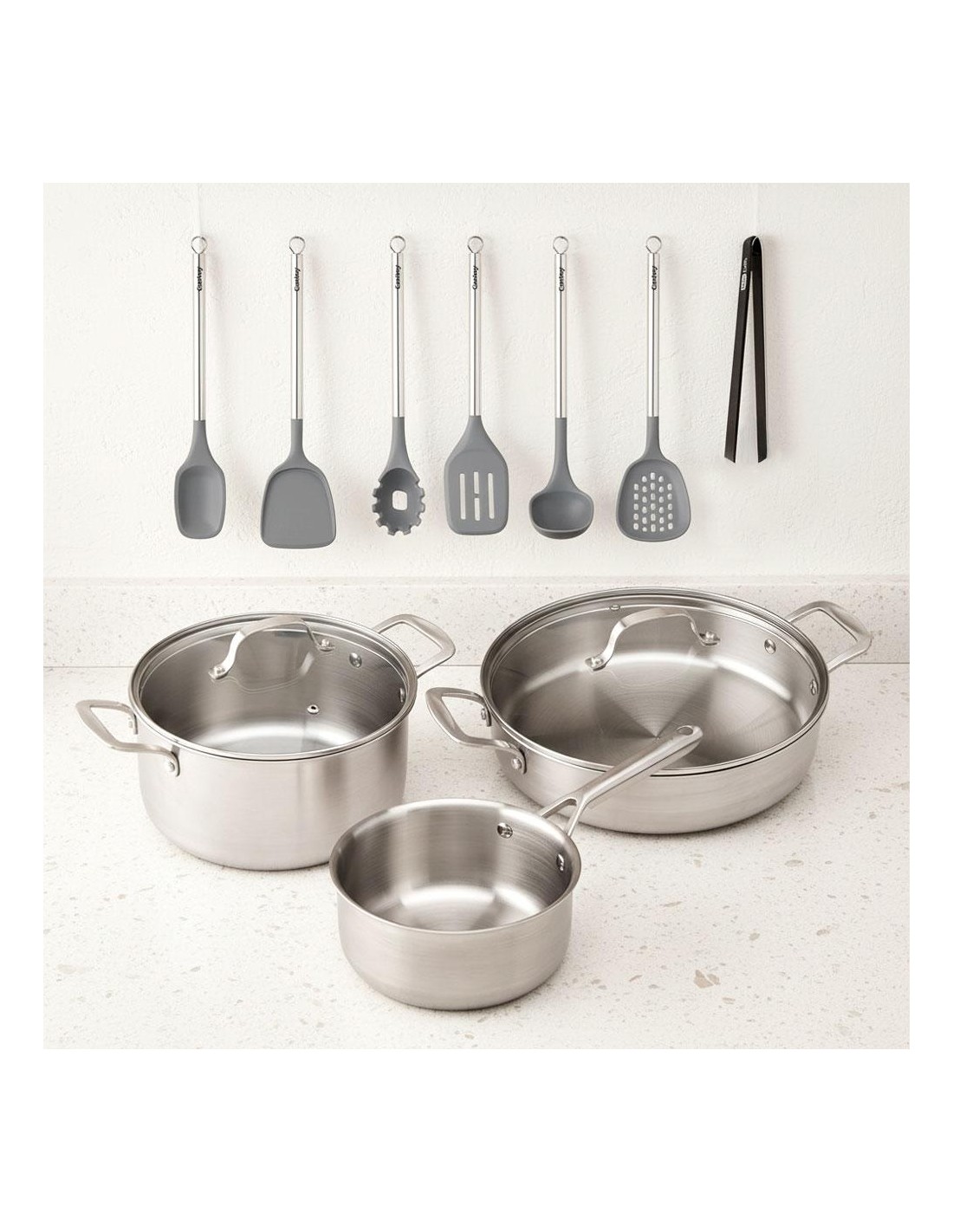 Los mangos y asas, también de acero inoxidable, refuerzan la robustez de cada pieza, garantizando una larga vidal útil y un rendimiento excepcional en la cocina.