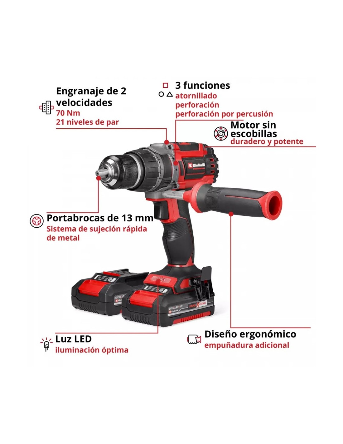 El taladro percutor con batería TP-CD 18/70 Li-i BL (2x2,0 Ah) Einhell Professional se envía en el set con una E-Case S-F dos baterías, de 2,0 Ah Power X-Change y un cargador. Gracias a la batería y batería intercambiable, el atornillador está listo para su uso de forma inmediata y duradera.