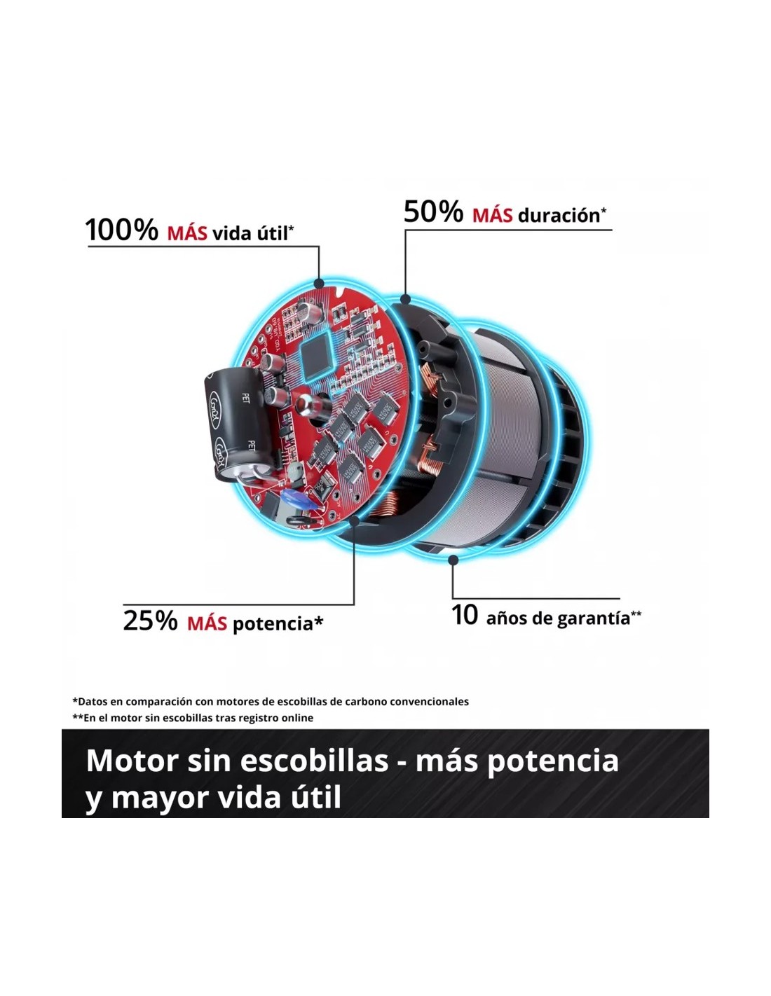 El motor sin escobillas aporta máxima potencia, duración y vida útil. El motor sin escobillas no está sometido a desgaste y así está libre de mantenimiento. Al registrarse online es válida una promesa de servicio de 10 años en el motor.