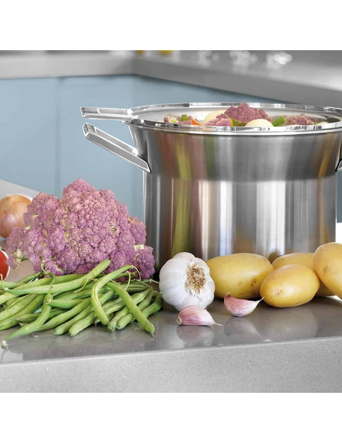 • Incluye una tapadera reversible con dos posiciones: totalmente cerrada para retener el vapor y parcialmente abierta para liberarlo. También puede usarse como bandeja de servir o salvamanteles.