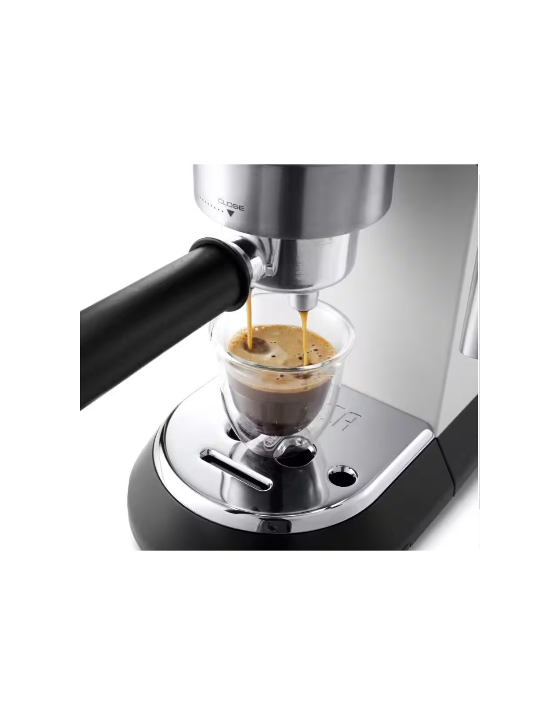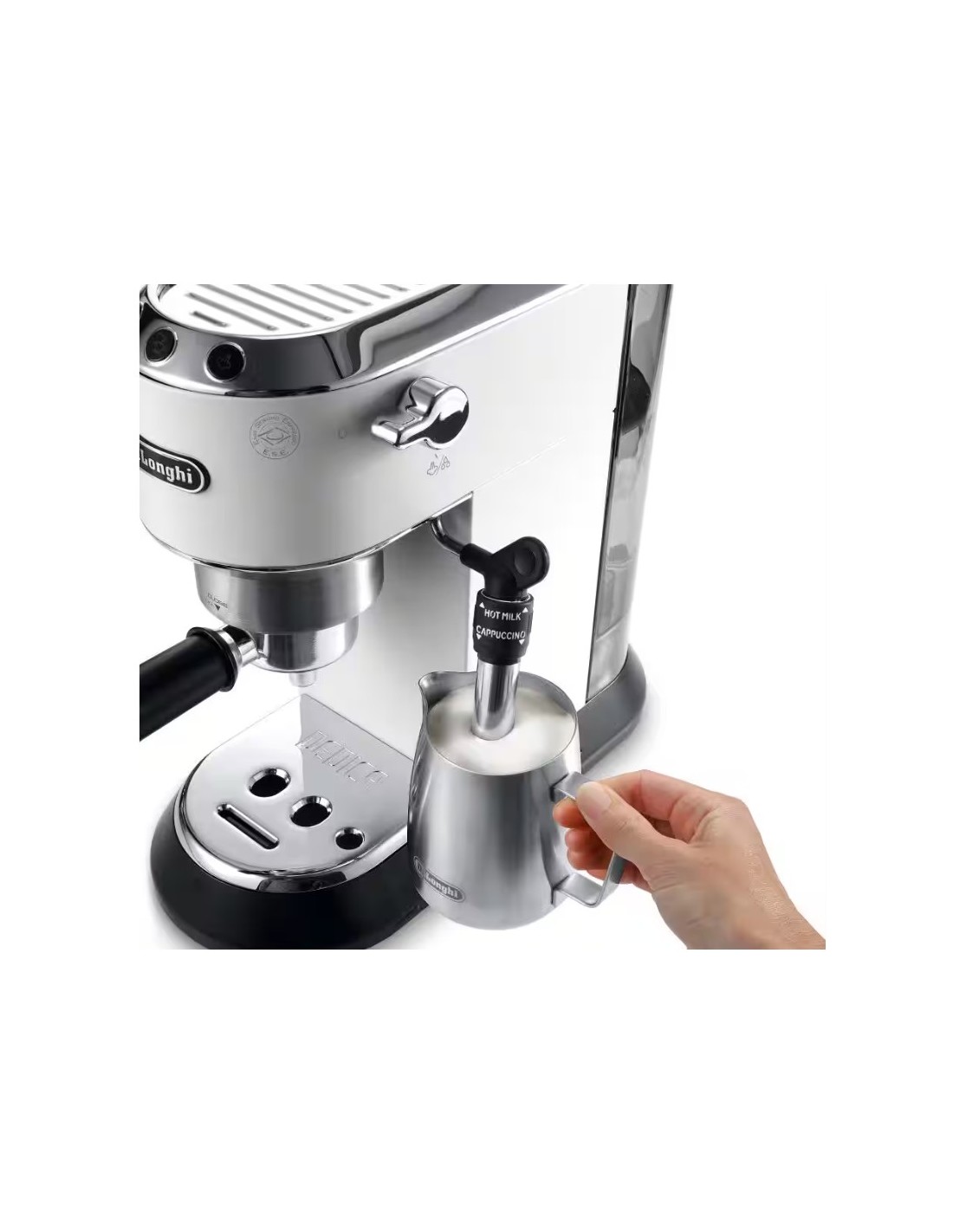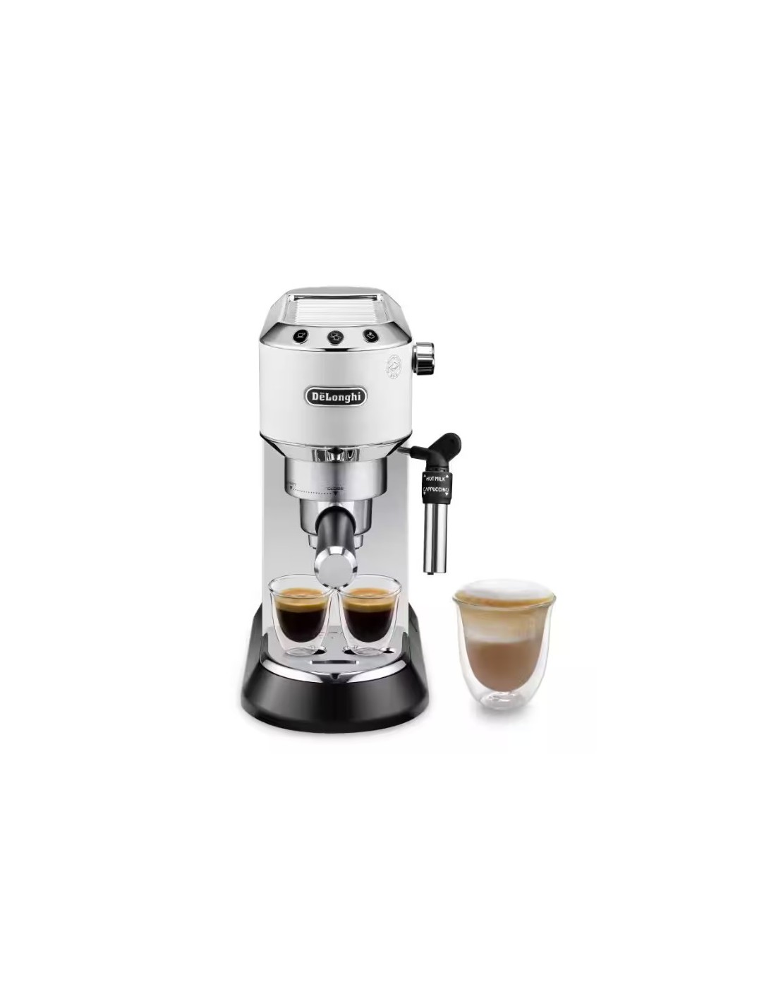 Cafetera elegante y compacta diseñada para complementar la encimera de tu cocina. Con su brillante cuerpo de acero inoxidable y su acabado blanco mate, la cafetera Espresso Dedica añade un toque de auténtico diseño italiano a cualquier cocina. Disfruta de un rico y suave Espresso y utiliza el sistema Cappuccino ajustable para vaporizar leche o darle a tu café un acabado con una cremosa espuma de leche.