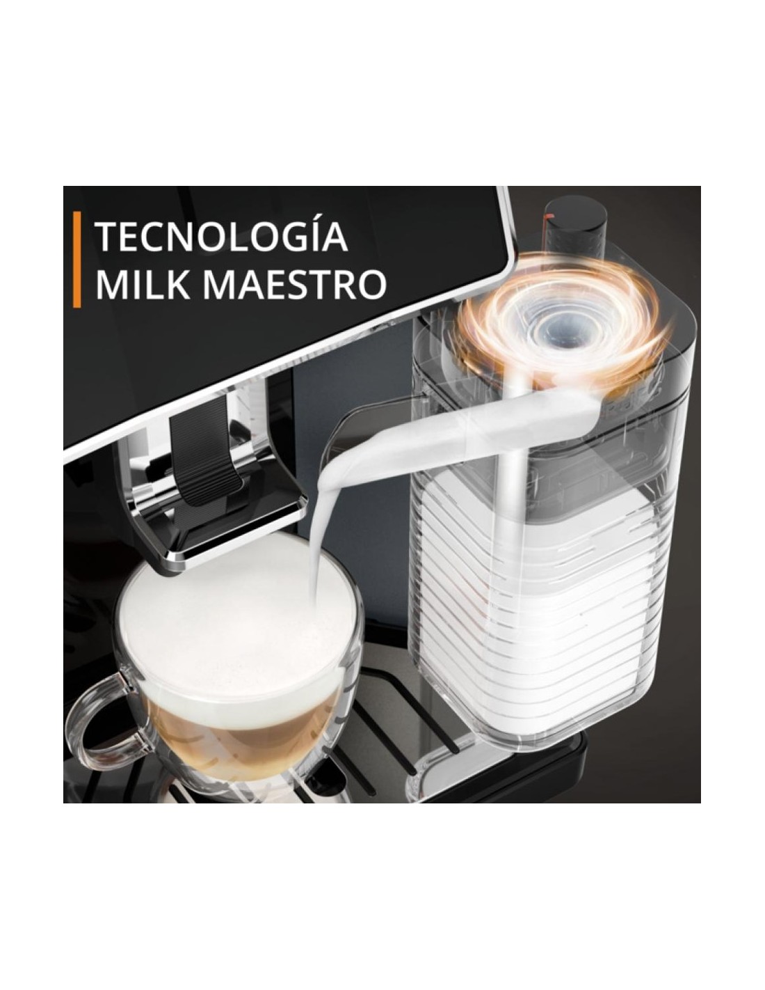 Cafetera automática equipada con tecnología exclusiva diseñada para espumar y calentar la leche de manera óptima con tecnología de vanguardia. Cuenta con un depósito de leche de 300 ml, permitiendo preparar de manera profesional entre 3 y 4 capuchinos de forma sencilla. Además, proporciona espuma caliente con un solo toque, facilitando la preparación de cafés y cafés latte de manera profesional.