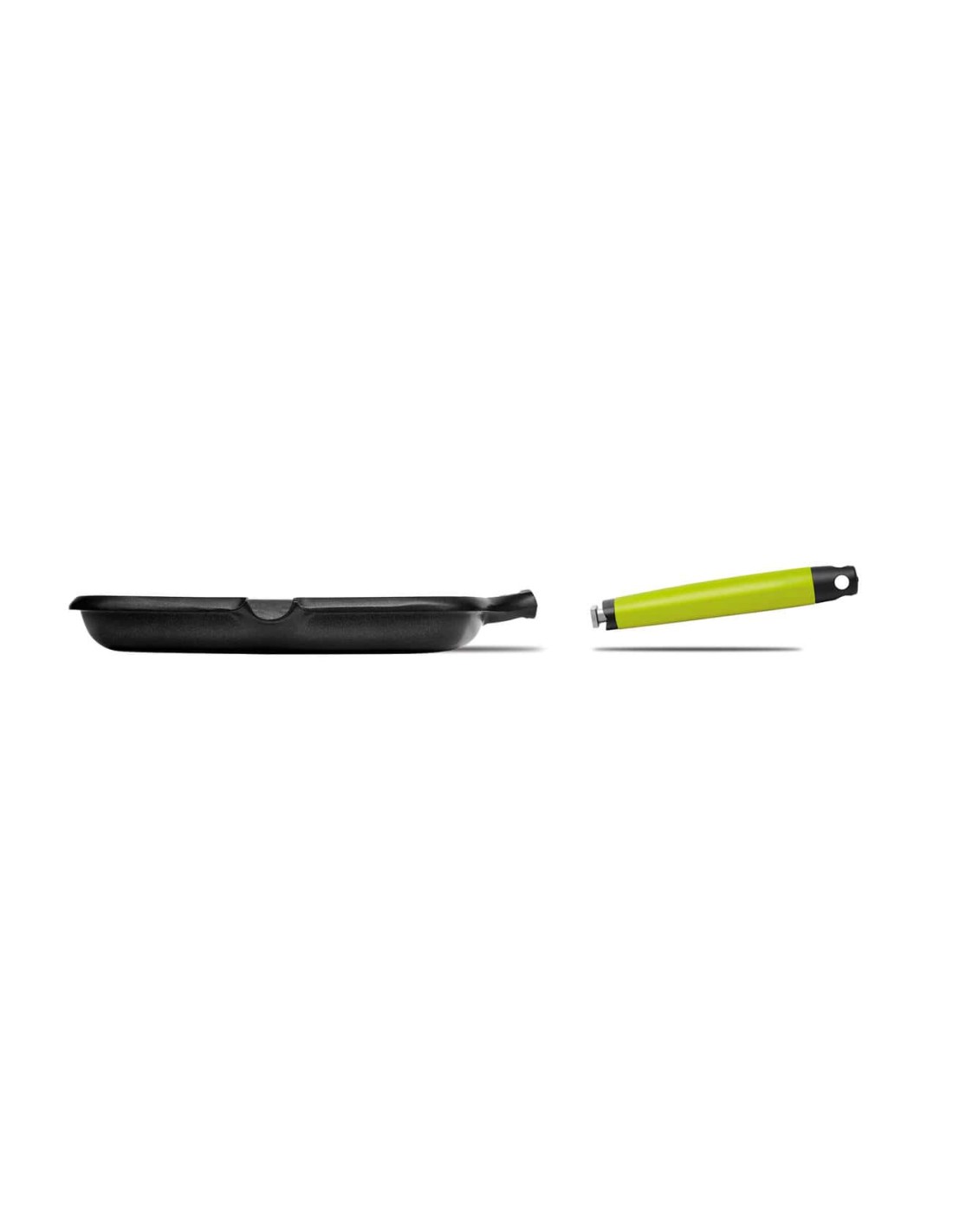 • Mango desmontable para limpiar a mano cómodamente, optimizar espacio en el armario y el lavavajillas, poner y quitar el producto del horno sin quemarse o convertirlo en un molde o cacerola.