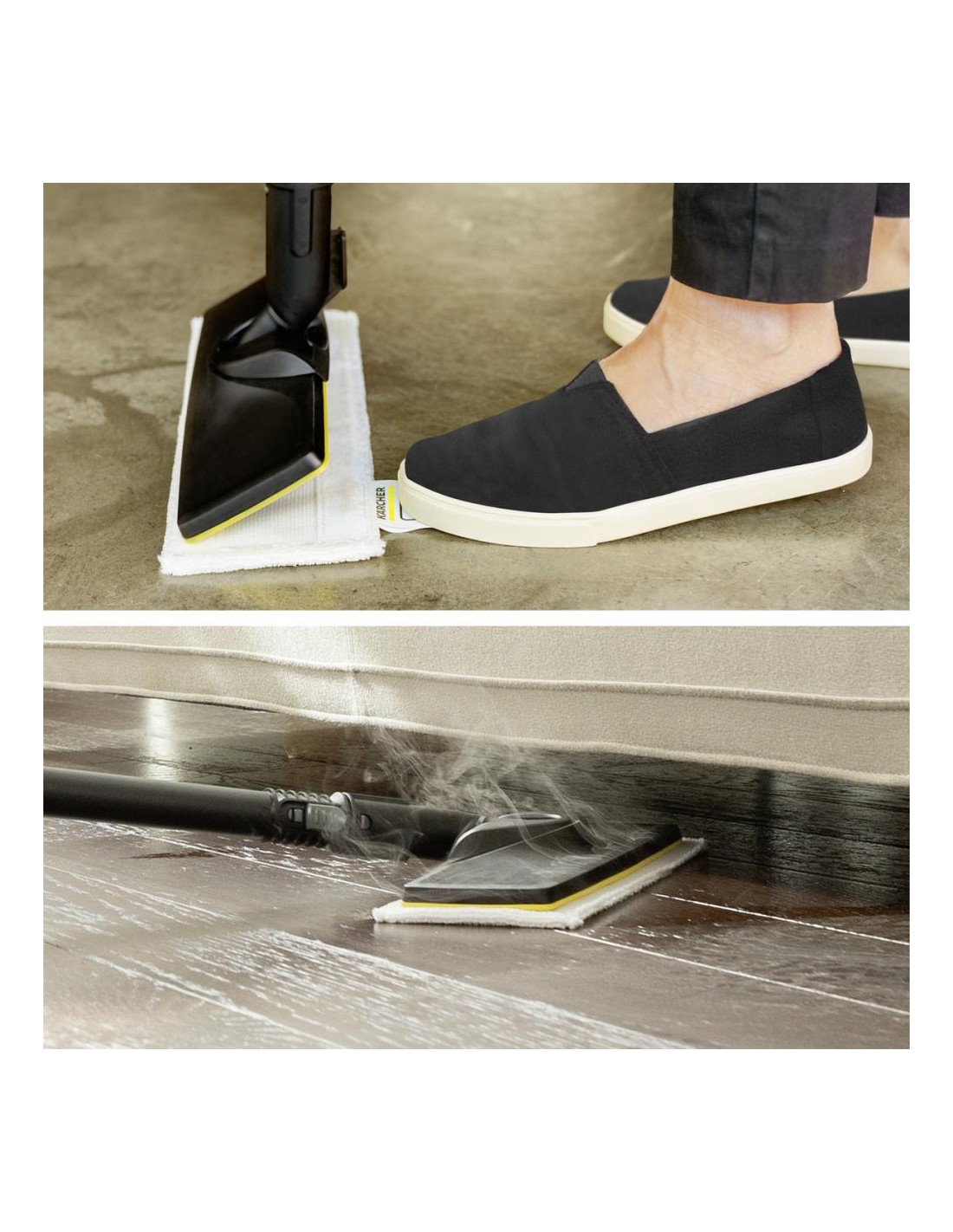 La limpiadora de vapor SC 4 EasyFix ofrece una gran comodidad y destaca por incluir un compartimento para el cable, un compartimento de almacenaje para los accesorios y una posición de estacionamiento para la boquilla para suelos. Gracias a su articulación flexible, la boquilla para suelos EasyFix ofrece la máxima ergonomía y la tecnología de láminas consigue resultados impolutos. El cómodo sistema de cierre de autofijación permite fijar de manera sencilla y rápida el paño para suelos a la boquilla para suelos y retirarlo sin tocar la suciedad. La regulación en dos posiciones permite ajustar la intensidad del vapor en función de la superficie y la suciedad. Los variados accesorios devuelven el brillo rápidamente a los azulejos, la placa de cocina, la campana extractora y hasta las ranuras más pequeñas, incluso con suciedad resistente. El depósito de agua extraíble y rellenable de forma permanente permite limpiar sin interrupciones. La SC 4 EasyFix limpia sin productos químicos y es ideal para su uso en toda la casa. Mediante una limpieza en profundidad con la limpiadora de vapor de Kärcher se elimina hasta el 99,999 % de los virus* y el 99,99 % de todas las bacterias comunes** de las superficies duras que se encuentran normalmente en el hogar.