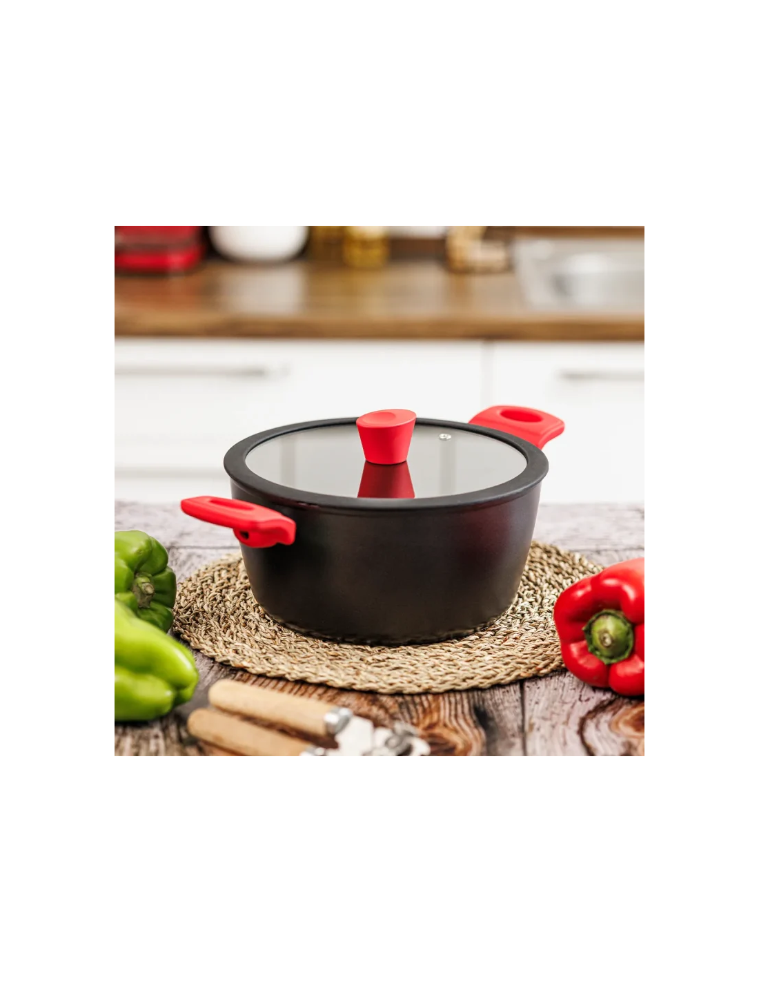 - Tapadera de cristal con aro protector de silicona y pomo de baquelita.