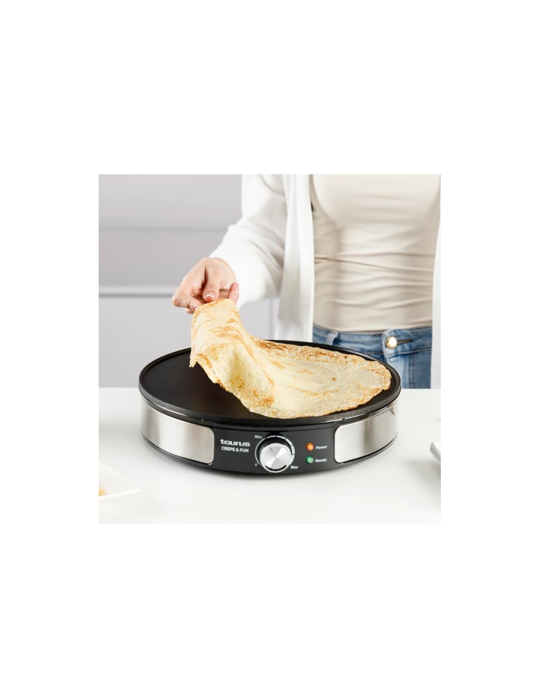 La crepera Crepe & Fun de Taurus ofrece una superficie de 30 cm con recubrimiento antiadherente libre de PFOA y BPA, garantizando crepes perfectas sin que se peguen. Su borde elevado evita derrames, mientras que su potencia de 1200 W y termostato regulable permiten un calentamiento rápido y preciso. Con base antideslizante, alojamiento para el cable y acabados en acero inoxidable, es práctica y duradera. Además, incluye espátula y esparcidor de madera.