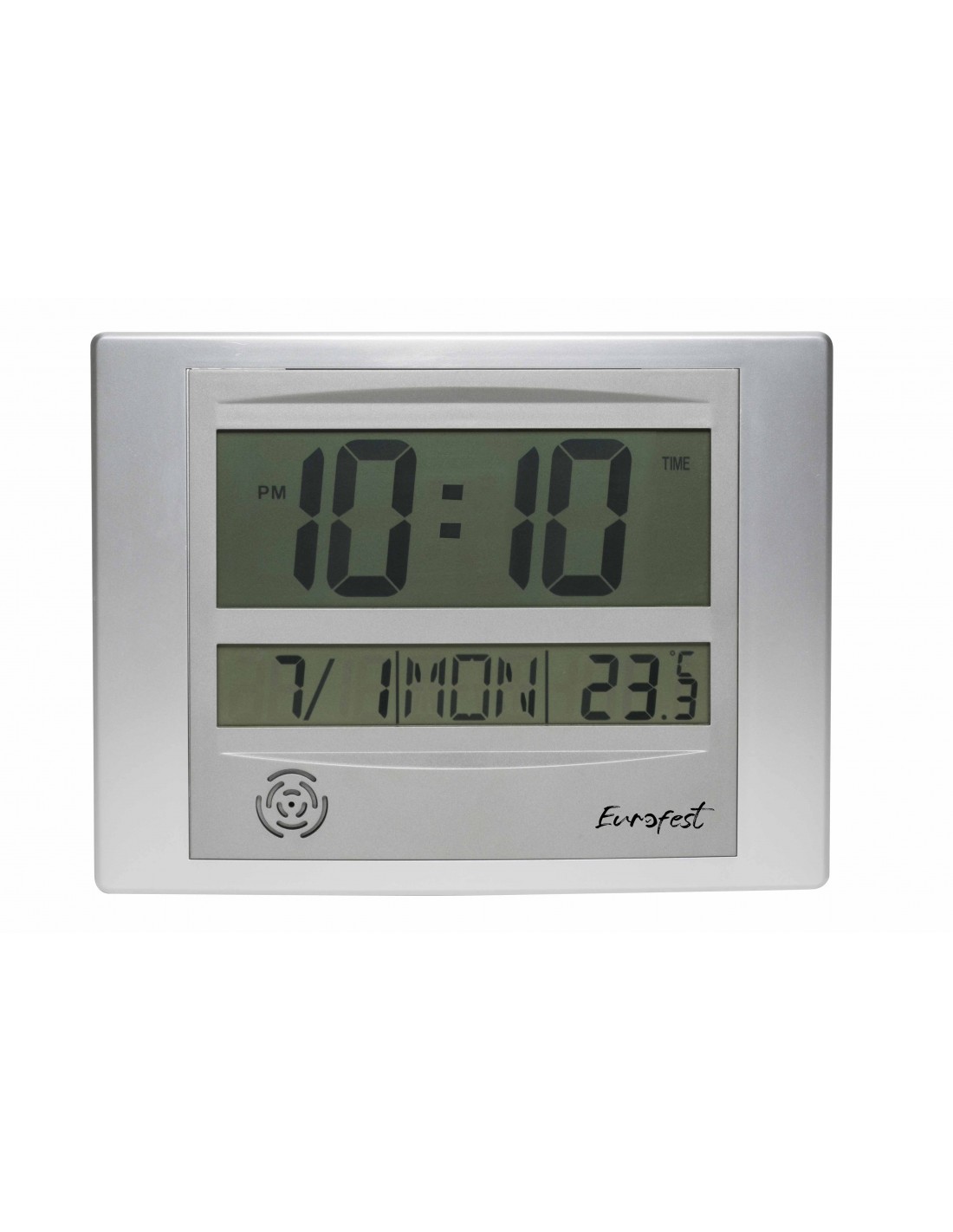 Reloj digital de pared o sobremesa con temperatura, calendario, día de la semana Y repetición. Pendule à posser et à accrocher avec température, calendrier, date et répéticion. Digital clock for table or wall with temperature, weekday, calendar and snooze. Digitaluhr für Tisch oder Wand mit Temperatur, Wochentag, Kalenderanzeige, Schlummerfunktion Color: Plata. Medidas: 25 x 2,6 x 19 cm.