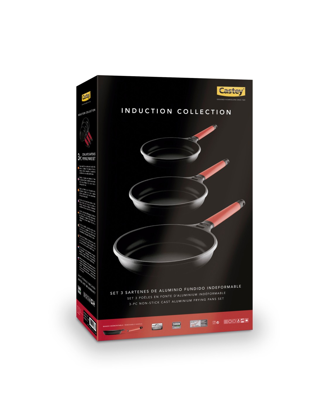 Set de 3 sartenes Castey Induction. Antiadherente libre de PFOA de alta calidad y resistencia. Cuerpo de aluminio fundido. Base full Induction. Mangos desmontables.