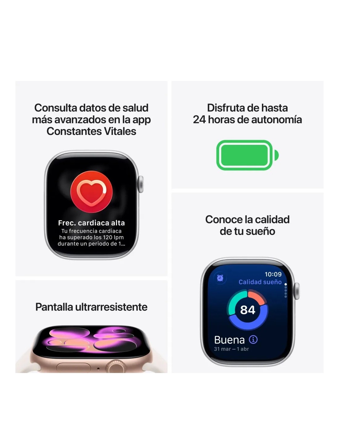 - AÚN MÁS DATOS DE SALUD — Recibe notificaciones de frecuencia cardiaca alta o baja, consulta tu datos de salud nocturnos con la app Constantes Vitales y mídete la saturación de oxígeno en sangre.