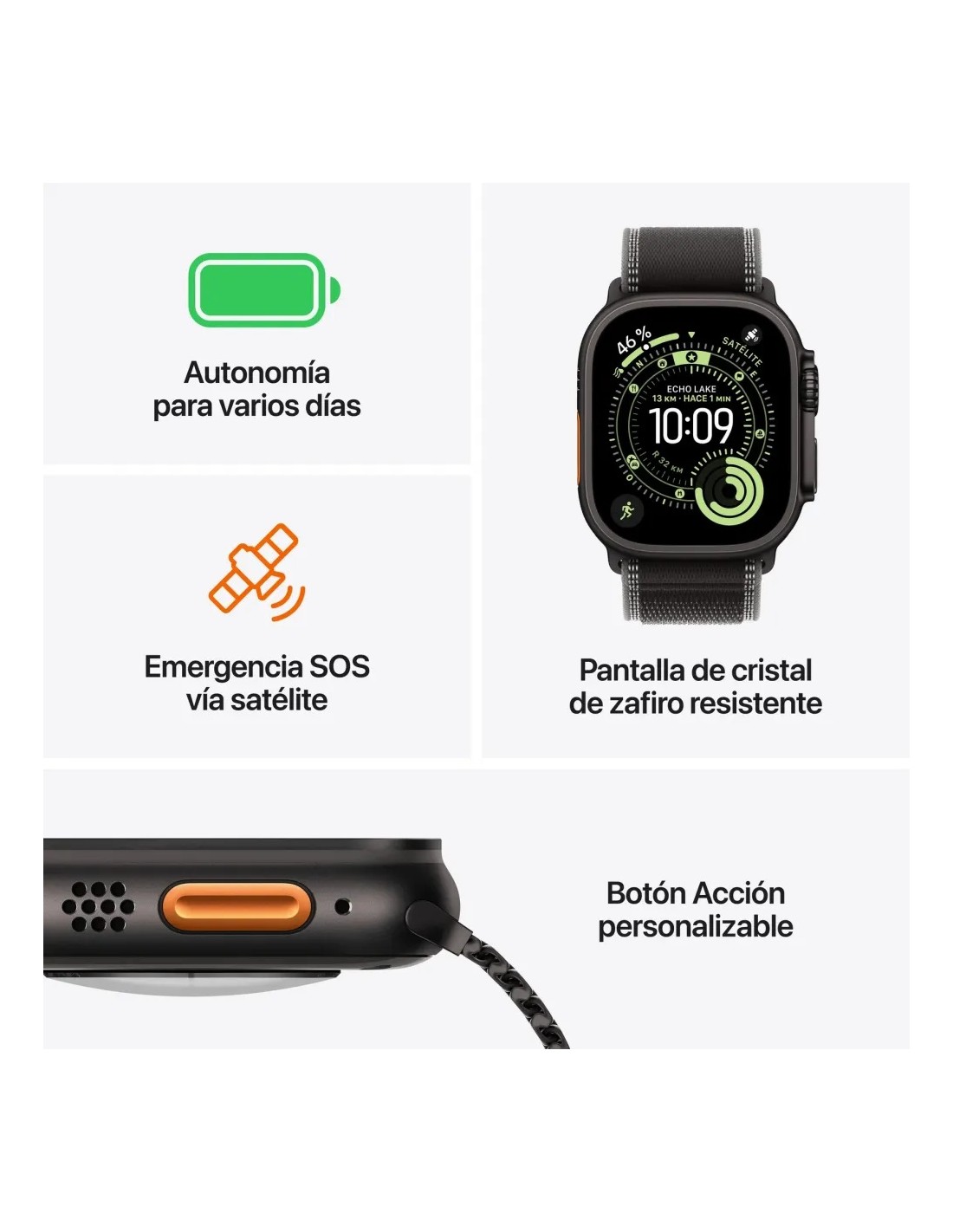 El Apple Watch Ultra 3 ahora incluye comunicaciones vía satélite, autonomía para varios días y la pantalla más grande y brillante en un Apple Watch. Por si eso fuera poco, también ofrece métricas avanzadas, Entrenos Personalizados, GPS de doble frecuencia y datos de salud detallados, como las notificaciones de frecuencia cardiaca alta o baja y calidad de sueño. Por algo se llama Ultra.