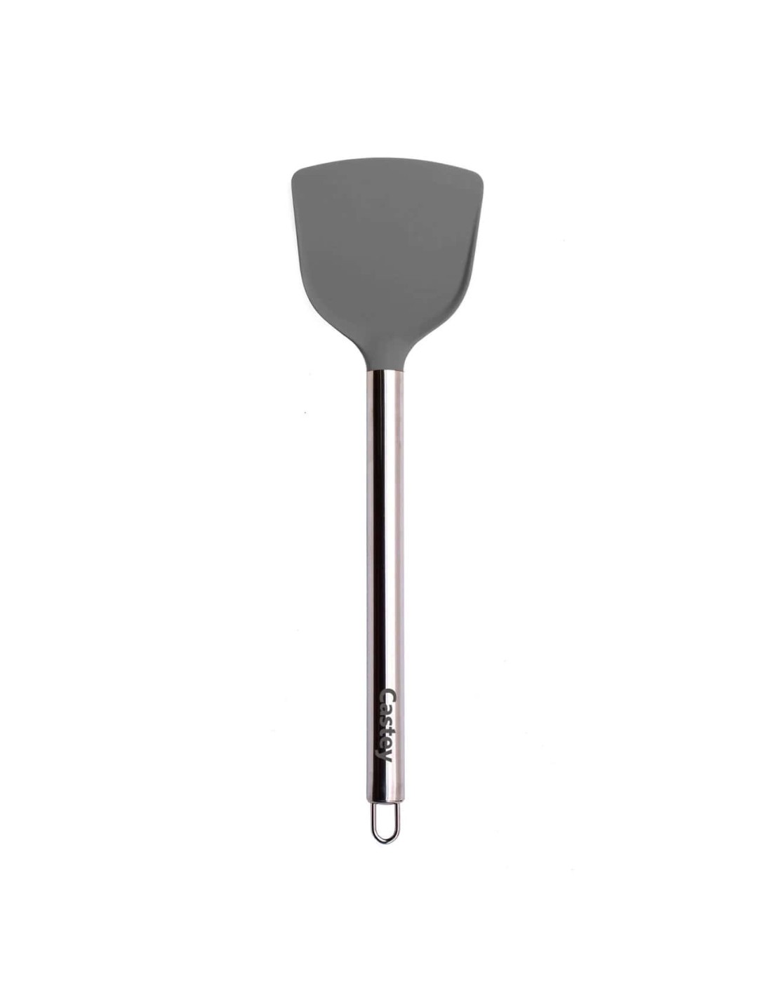 Espátula plana con cuerpo de silicona y mango inoxidable.